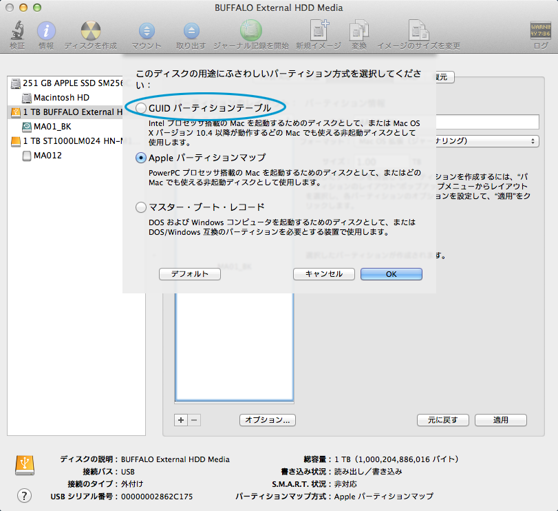 2パーティションなどを選ぶと、ハードディスクをMacの表示上で2つに分けて利用できますが、慣れないうちはシンプルに1パーティションでいきましょう(笑)